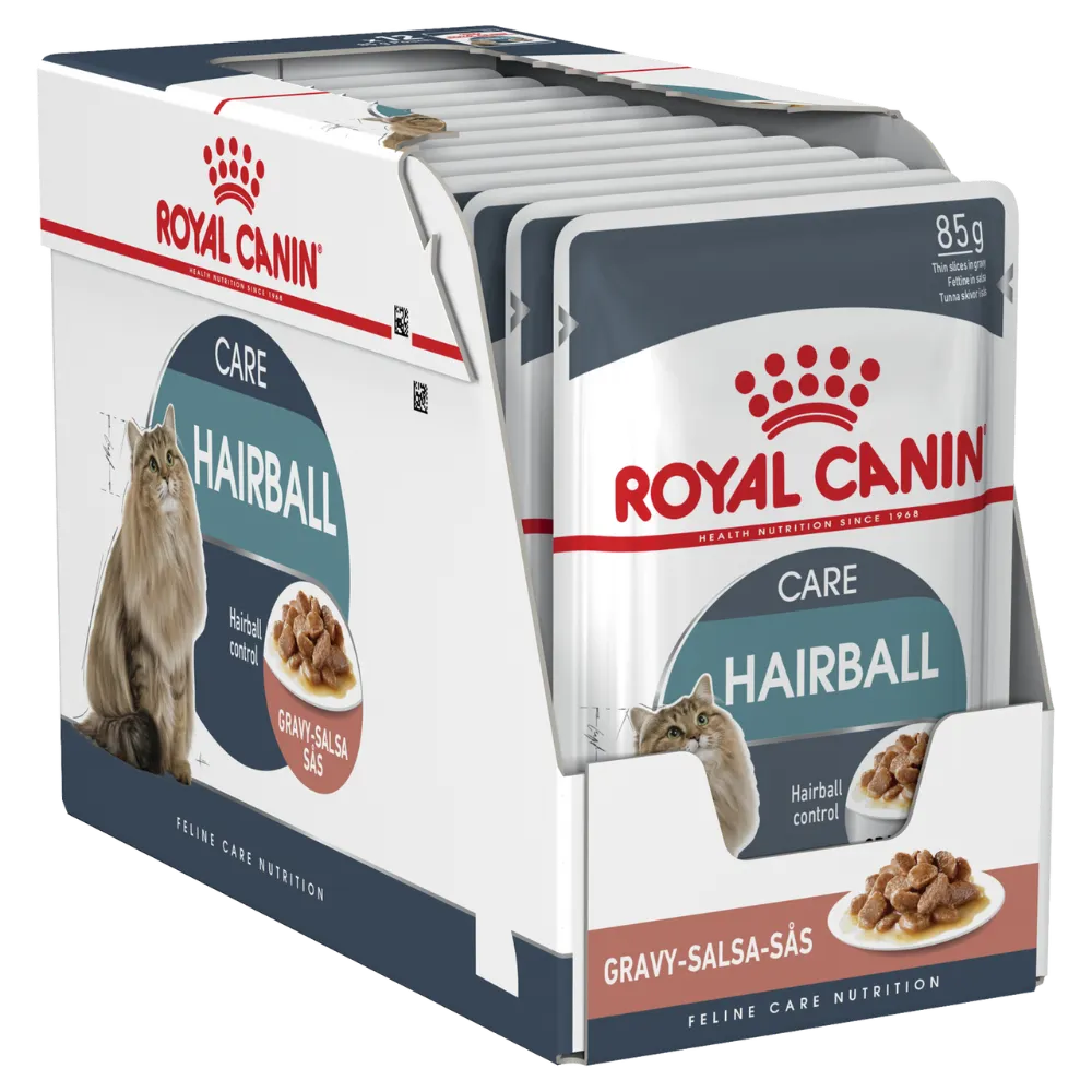 Hairballs occur when hair stays in your cat’s stomach without passing through the digestive tract. The majority of the hair travels through the digestive tract with ease, but large amounts of hair can result in hairballs. That’s why ROYAL CANIN® Hairball Care in Gravy is formulated to help your cat eliminate ingested hair by stimulating the intestinal transit passage – removing any excess hair that would usually remain in the stomach. ROYAL CANIN® Hairball Care in Gravy also helps to maintain your cat’s ideal weight – with a low fat content of just 2.7%. Essential fatty acids are included as well, to help provide valuable energy. High digestibility is supported through the inclusion of dietary fibre in ROYAL CANIN® Hairball Care in Gravy, this contributes to a balanced gut flora and healthy intestinal tract activity. To cater to each cat’s preferences, ROYAL CANIN® Hairball Care is also available as dry food, with crunchy and tasty kibble. If you’re considering mixed feeding, simply follow our feeding guidelines to ensure your cat gets an accurate amount of both wet and dry food for optimal benefit.