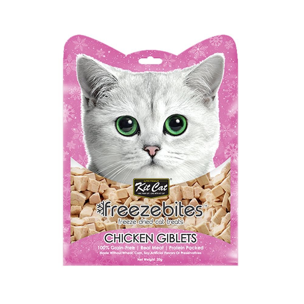 Kit Cat Freezebites cat treat are made with only 1 ingredient. This protein rich treat is ideal for cats of all life stages and especially made ideally for finicky eaters, cats with food allergies, stomach sensitivities or are on a restricted diet. Designed as a healthy daily snack made from pure and natural protein, we gently steam and then freeze dry this treat to lock in nutrients and concentrate natural flavors. Grain and gluten free with nothing artificial.