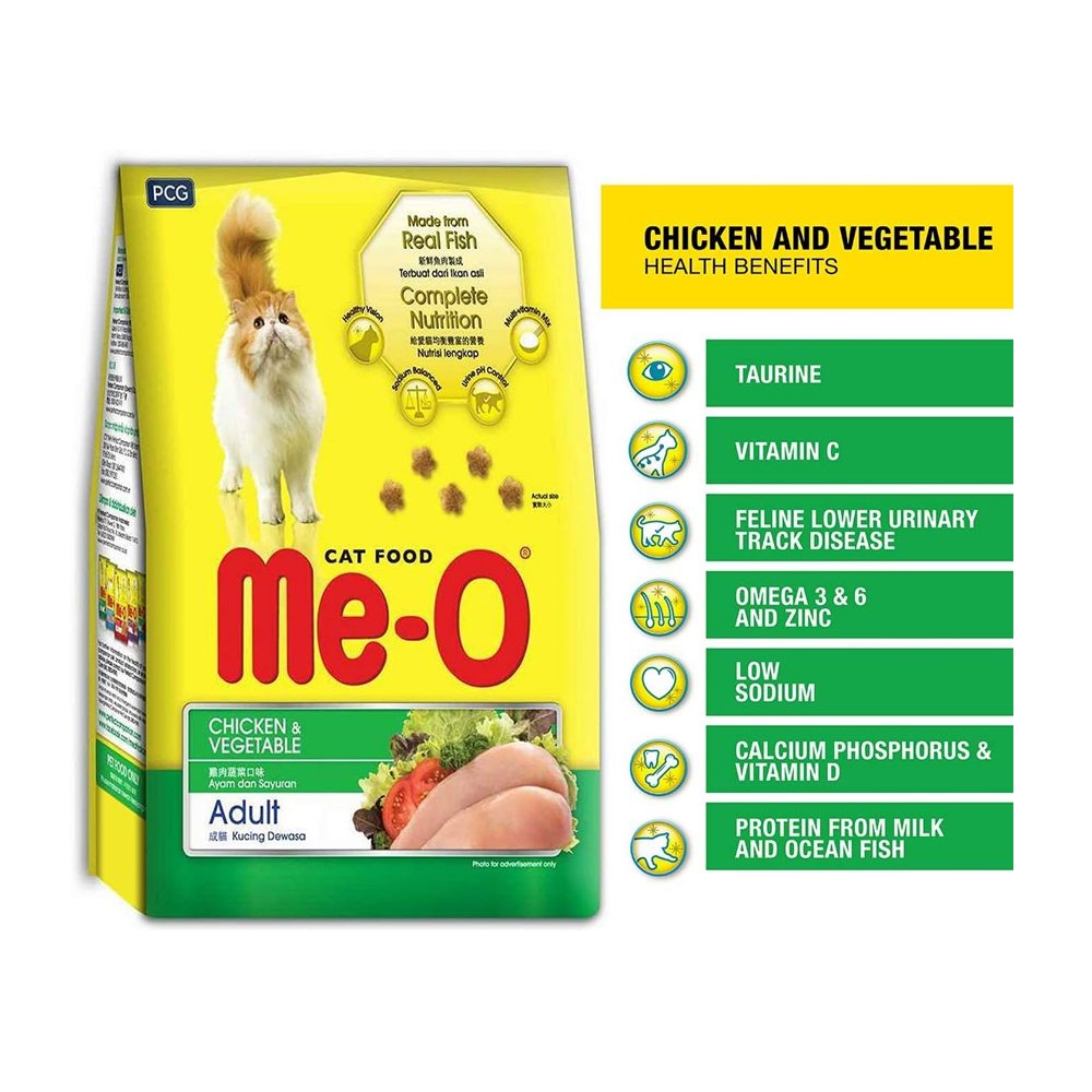 Give your *dult cat a nutritious and delicious meal with Me-O *dult Cat Dry Food. Made with chicken and vegetable flavor, this complete formula is enriched with a multi-vitamin mix to support overall health and wellbeing. Taurine helps maintain heart and vision health, while Calcium, Phosphorus, Vitamin C, and Vitamin D promote strong bones, teeth, and a healthy immune system. The crunchy kibble makes daily feeding enjoyable while providing balanced nutrition for your feline friend.